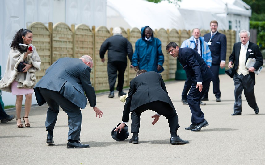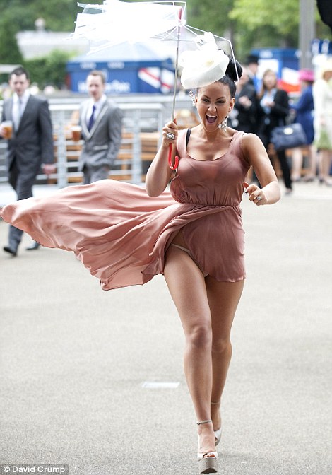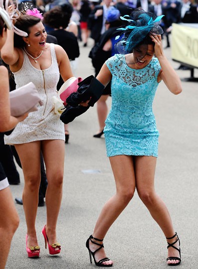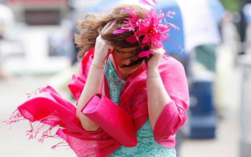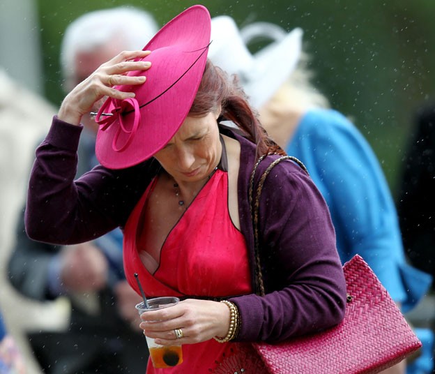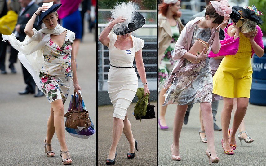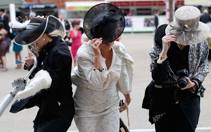 Μεγάλους μπελάδες προκάλεσαν οι δυνατοί αέρηδες στις κυρίες με τα πολύχρωμα καπέλα, τα ψιλοτάκουνα και τα αποκαλυπτικά φουστάνια που προσπαθούσαν να κάνουν εντυπωσιακή είσοδο στον φημισμένο Ιππόδρομο του Μπέρκσαϊρ.